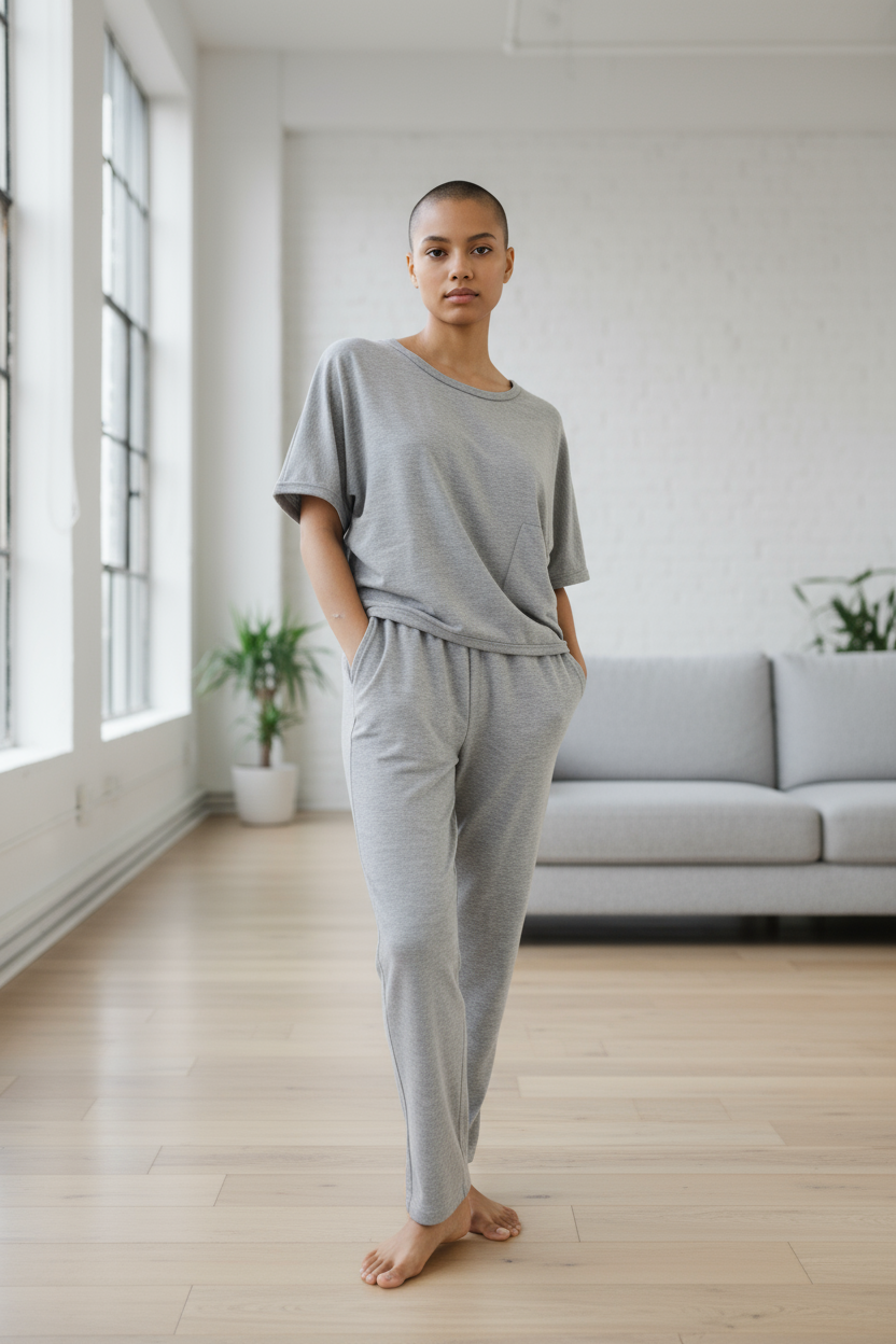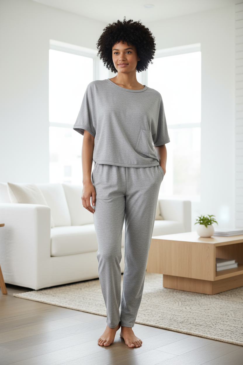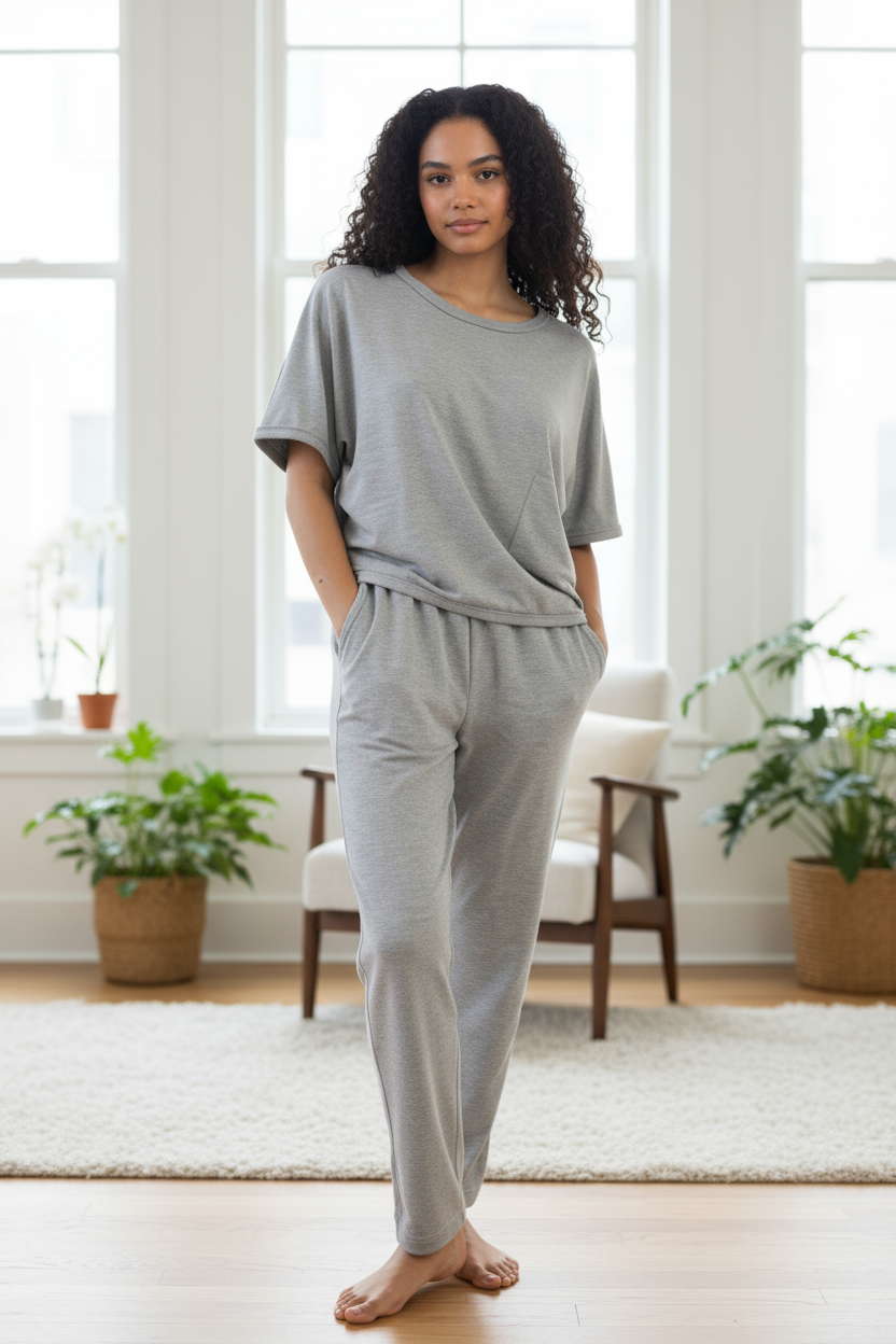 Relax, reset and recharge with this two piece pant set crafted from a breathable blend of bamboo viscose and spandex. Note: top and bottom are the same size